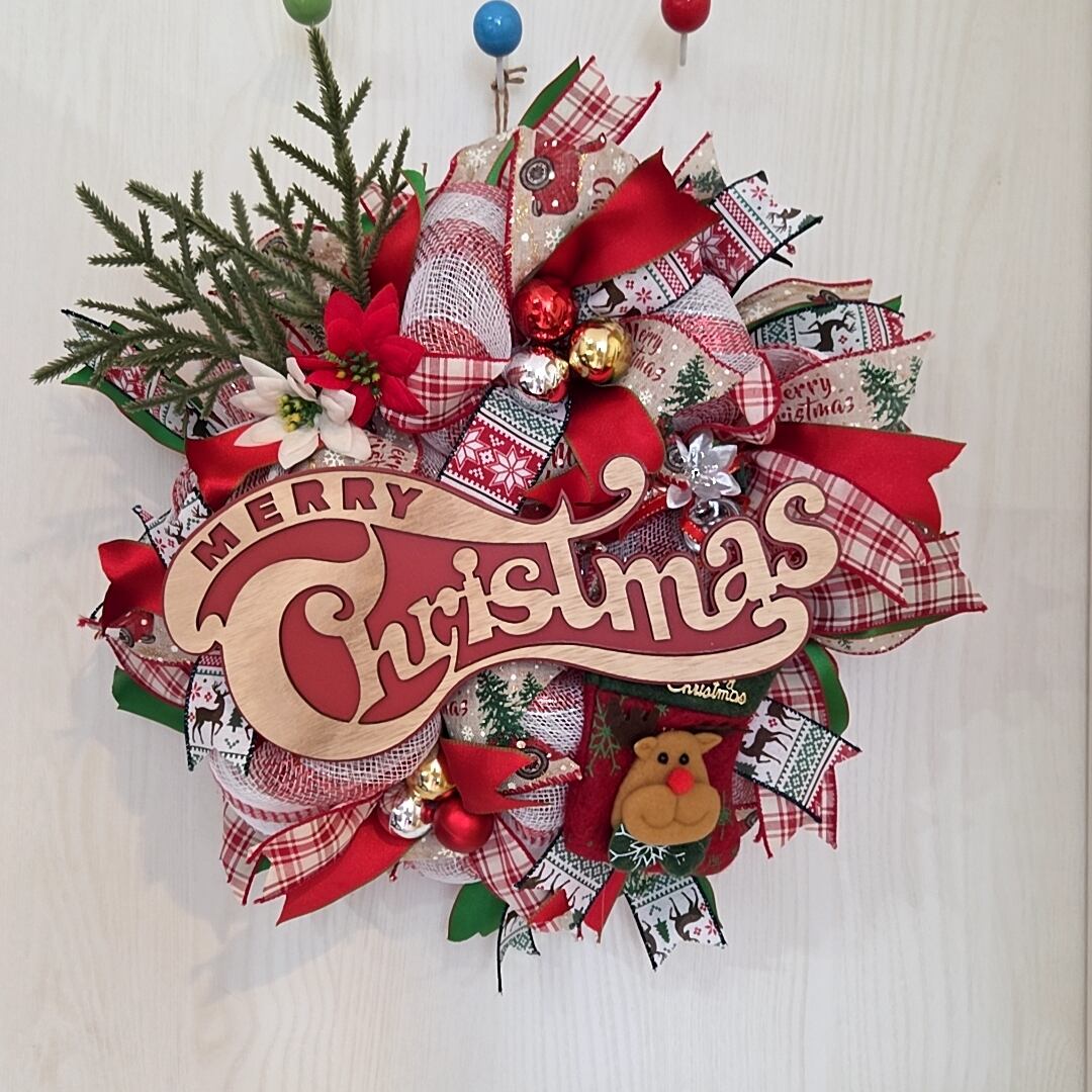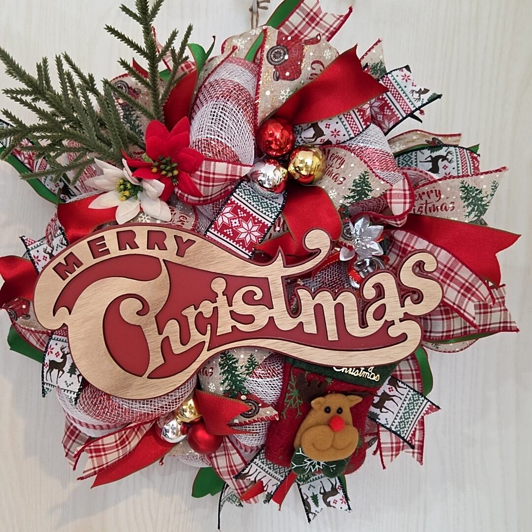 クリスマスカラーの緑&赤をメインとしてクリスマス柄のリボンをメインにデコメッシュを使ってふわっと仕上げており立体感があります。サインボードをアクセントにしてよりいっそうクリスマス感を演出しております。他のリースにはないボリューム感をお楽しみください。