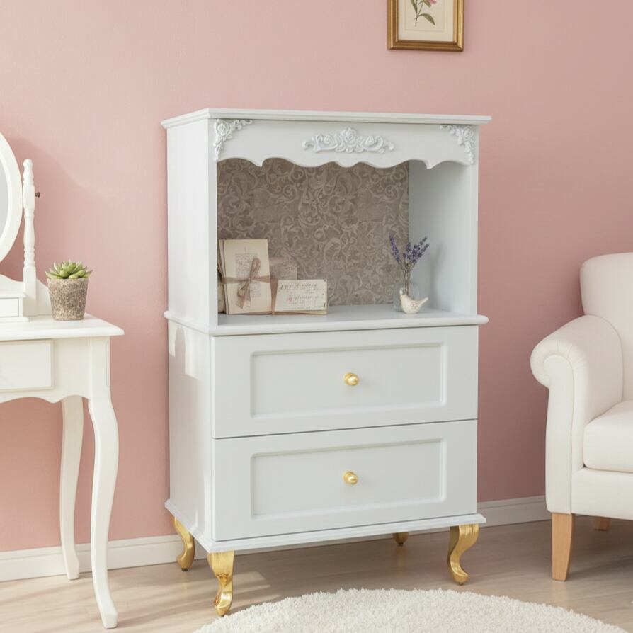 ロココ調の優美なデザインと、フレンチカントリーのやさしい雰囲気をミックスした、大人可愛い2段チェストです。