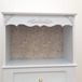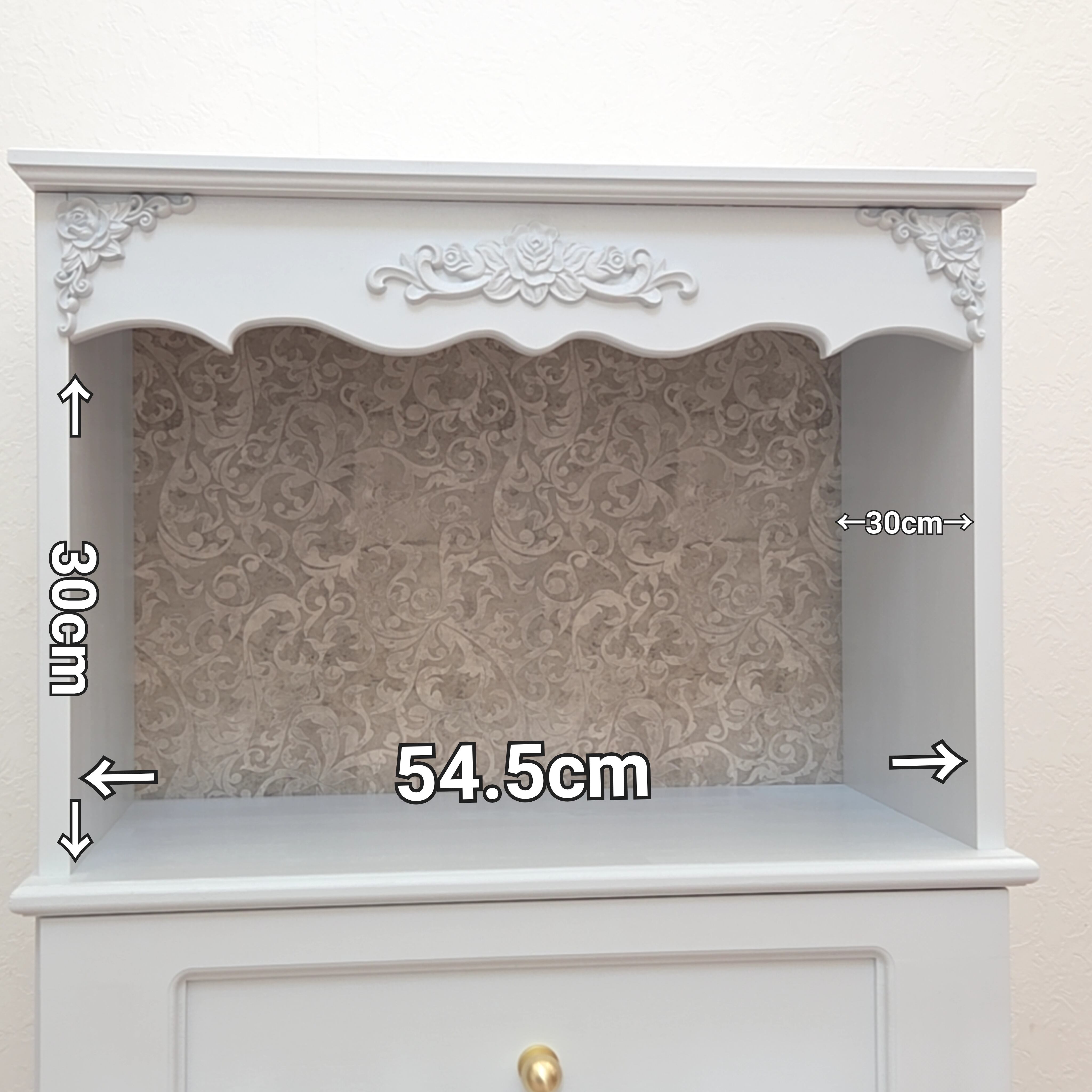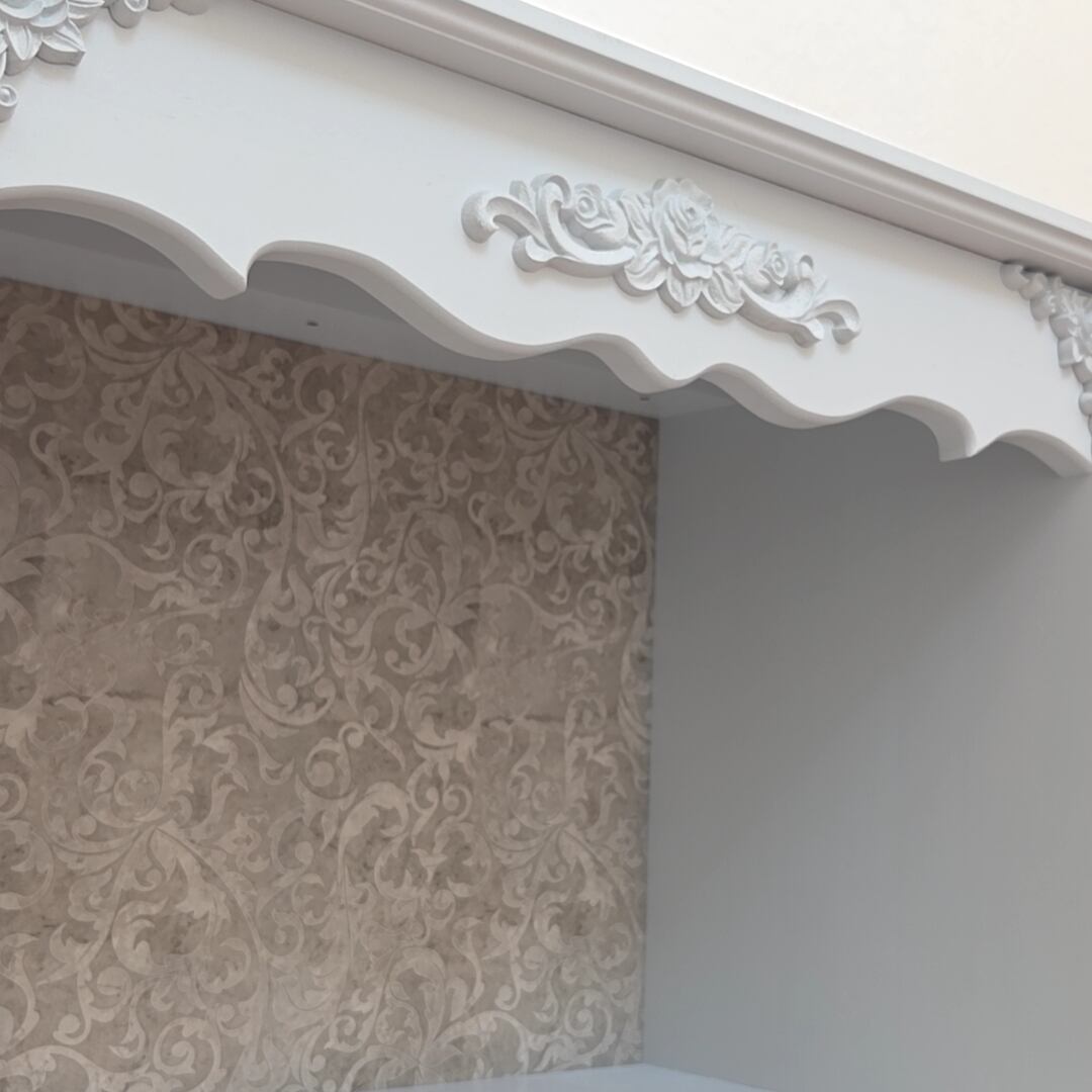 上品なダマスク柄の棚背面: オープン棚の背面には、シャビーシックなグレーのダマスク柄を施しました。アンティーク調の小物や、お気に入りの雑貨を飾るだけで、そこがまるでヨーロッパのディスプレイのような特別な空間になります。